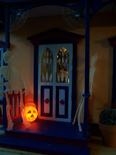 Do you remember when all it took was the addition of a simple piece of cloth, a towel perhaps, to transform you into someone else? It became the cape worn by a magician, or the cloak of a superhero, or the gown of a princess..... or anyone you could imagine! Well, if YOU can't remember, I hope you will forgive Tommy for his costume! I can remember when a costume was not always bought in a store, but was more often made from whatever was at hand at home. And when Tommy was young, ALL the clothes were made at home, so I am sure he would have had to invent his costume himself! So with the simple addition of a cloth wrapped around his shoulders he is ready to go "Trick-or Treating"!The first house they come to is the Lovely Old Dollhouse.