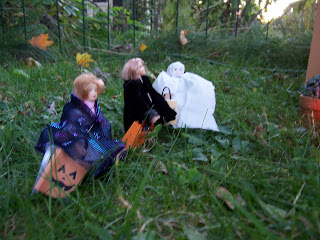 He's not afraid to go get treats. But Caroline and Beatrice are a little nervous! It IS getting a little dark now...... and they don't like the skelletons! Tommy says he will get the treats for them!