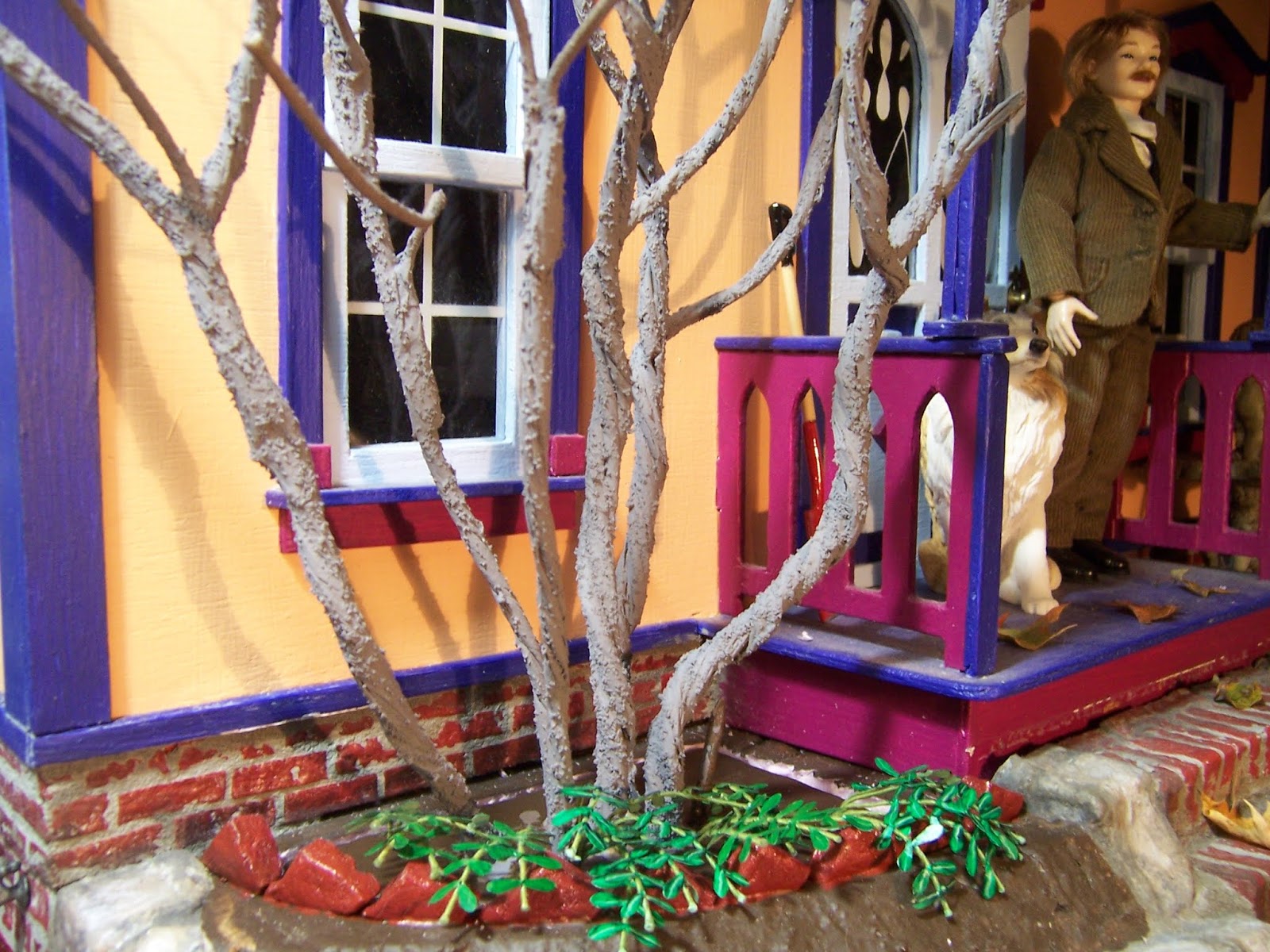 I have to admit, Dear Readers, that the Summer is gone and there just is not enough Natural light to illuminate the Completed Summer Lilac Shrub in the way I would like to see it... glowing in summer sunshine! And there is even a sense of anticlimax to the Grand Opening of the Grand Finale of this very long project! The gloomy view from the porch of The Folly is perhaps just the right mood. Can you believe it? The final Lilac Shrub is finished? Well, I will admit that there is a caveat to this... the Ground underneath all the shrubs has yet to be completed.. with moss and other details... but the Shrubs are done!