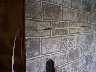 One of the complicated parts of this Castle Entrance, Dear Readers, is figuring out which little detail needs to be taken care of Before another one is accomplished, because attempting to manage it later would be too difficult. And since it is really the door And the Electrical systems I am building, it requires that I jump all over the place! So it is that Before I can attach the outer wall to the stairs and electrical box, I need to finish the doors themselves (as well as the electrical wiring, but more about that later!). Above, you can see I have "painted" the boards for the doors and the hinges too. This is following the same method I started years ago, and while there are surely more sophisticated methods of making doors, this is the one I have used for the Castle. I am, after all, just building a Castle Dollhouse from plywood! And after painting the brass hinges, I baked the sculpey "hinge straps" along the same model as for all the doors. And glued them in place. I use basic wood glue for this.